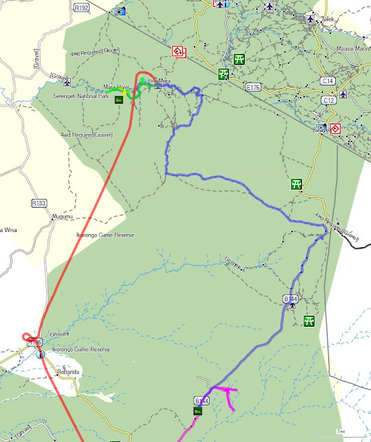 Our gps track for the day is in blue. Lunch was near the top of this map, just south of the Mara River. Mbuzi Mawe Serena Camp is the green square near the bottom. |